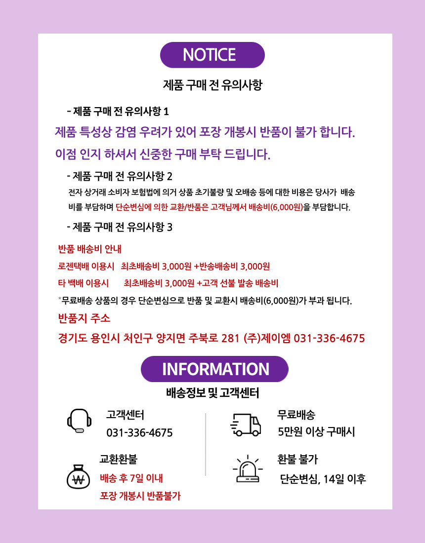 - 상품 불량 및 오배송의 경우, 상품 배송일로부터 7일이내 교환 및 반품이 가능하며 택배비는 본사에서 부담.